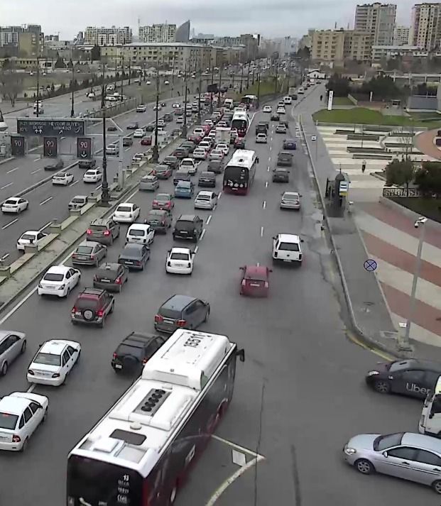 Heydər Əliyev prospekti şəhər istiqamətində kənar yolda nəqliyyat vasitələrinin hərəkətinə tətbiq edilən məhdudiyyət səbəbindən sıxlıq müşahidə edilir.